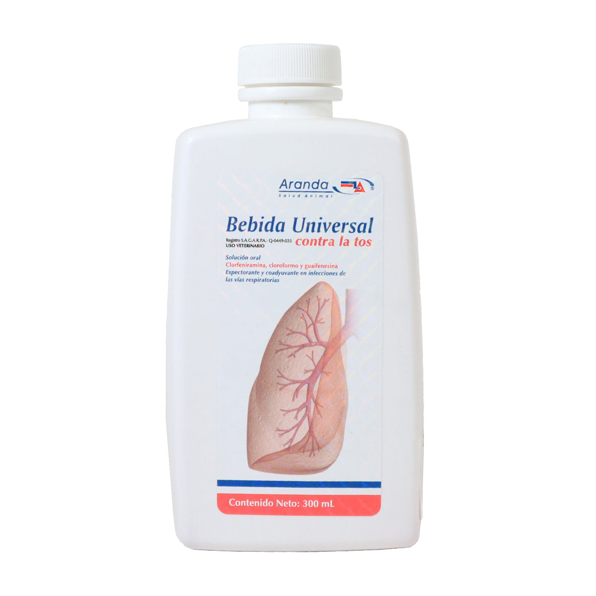 Aranda Bebida Universal para la tos 300 ml es un producto de amplia acción para controlar los ataques de tos en bovinos, equinos, porcinos, ovinos, caprinos y caninos. Su acción expectorante ayuda a prevenir la acumulación de moco en las vías respiratorias superiores. Es coadyuvante en el tratamiento de bronquitis, neumonía, influenza y otros trastornos del aparato respiratorio.