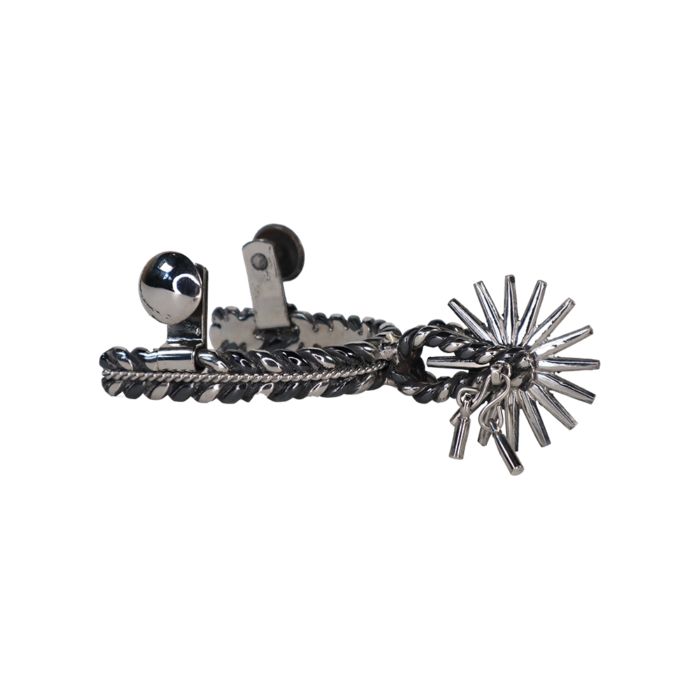 Esta espuela para caballo está diseñada con una doble torcedura y un acabado en color pavonado para un look elegante. Proporciona un control y dirección precisos para mejorar el rendimiento y la experiencia de montar a caballo. Ideal para jinetes experimentados en busca de una herramienta de alta calidad para sus caballos.