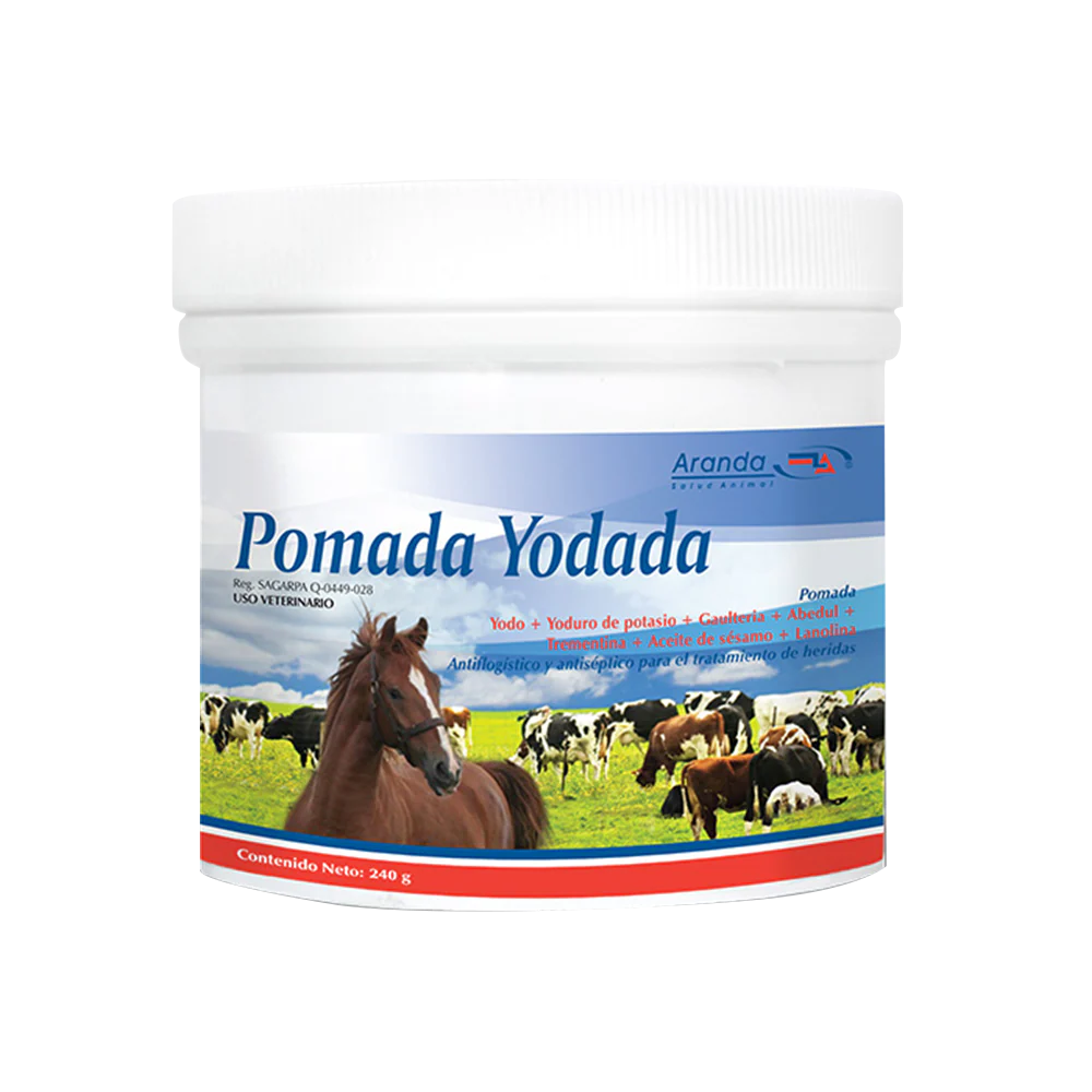 La Pomada Yodada 240 g es un antiflogístico y antiséptico local indicado para el tratamiento de heridas infectadas, inflamadas, rozaduras, mataduras, abscesos o infecciones localizadas. Su uso es recomendado en bovinos, equinos, ovinos, caprinos, porcinos, caninos, felinos y aves, ayudando a reducir la inflamación y acelerar la recuperación de heridas externas.