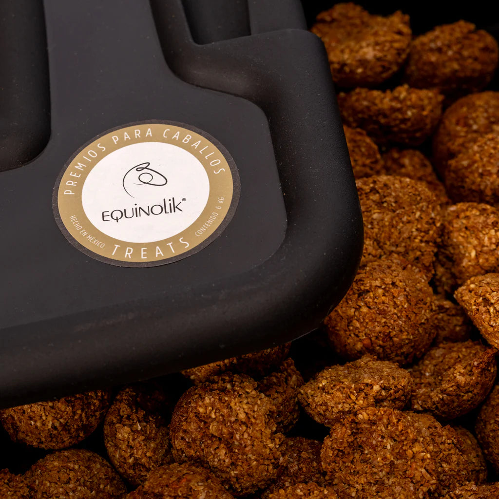 Premios para caballos en forma de galletas, elaborados con avena, germen, salvado, melaza, piloncillo. Adicionadas con arándano deshidratado para un sabor irresistible. Envase de 6.0 kg. *NO contiene harina.