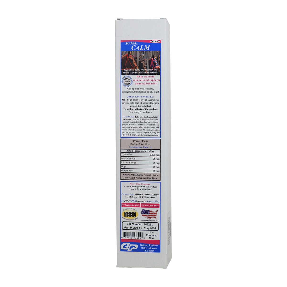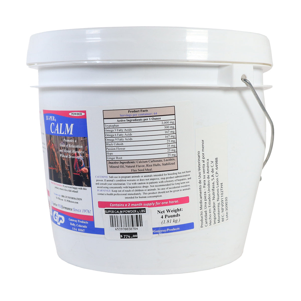 SU-PER® Calm es un suplemento natural diseñado para promover la relajación y mantener el equilibrio emocional en caballos nerviosos o estresados. Formulado con L-triptófano y extractos de hierbas, ayuda a calmar a los caballos sin causar somnolencia ni afectar su rendimiento atlético.