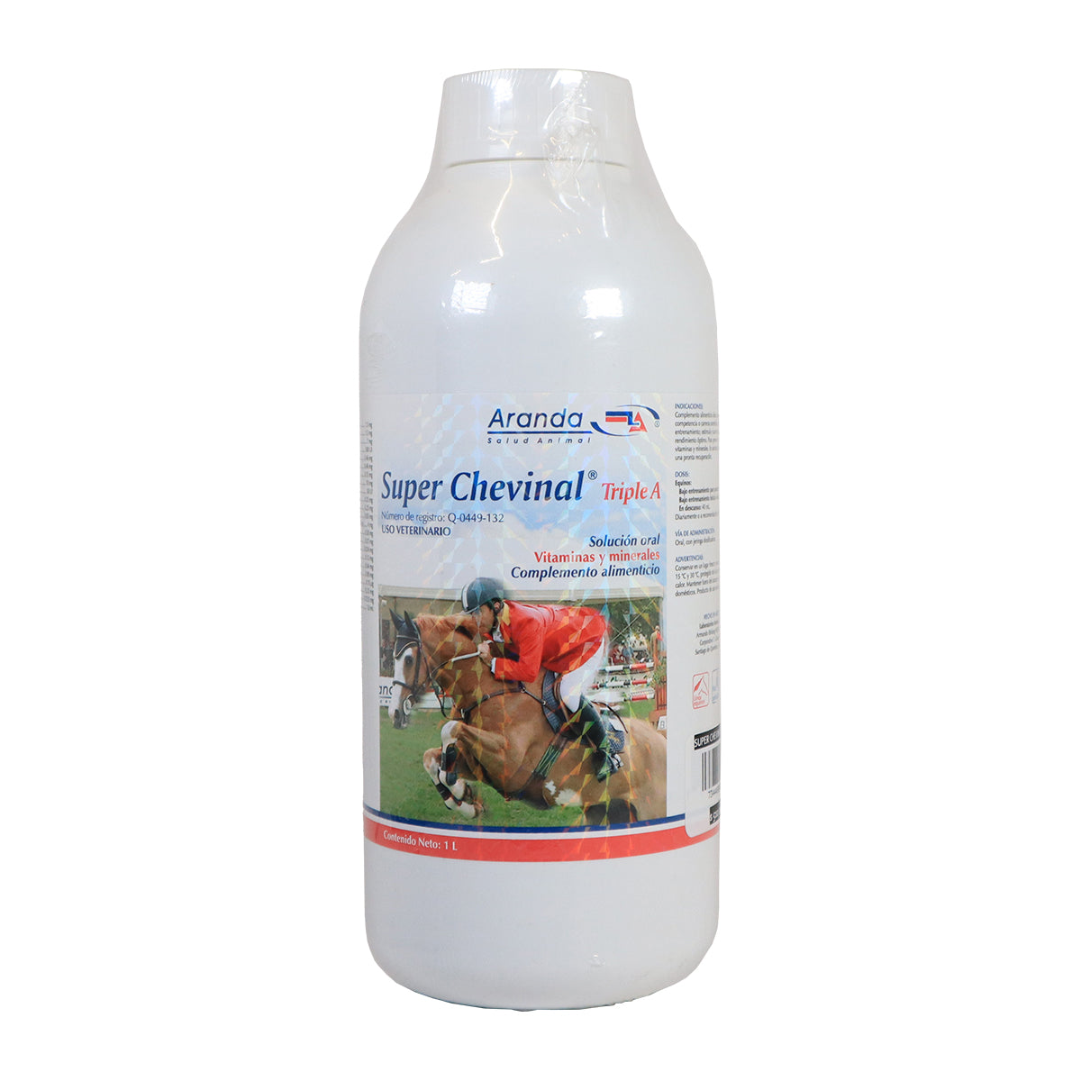 SÚPER CHEVINAL TRIPLE A es un jarabe vitamínico y mineral formulado para mejorar el rendimiento y estado general de los caballos de competencia. Actúa como reconstituyente, hematopoyético, anabólico, antineurítico y euforizante, proporcionando energía inmediata gracias a su alto contenido de fosfatos.