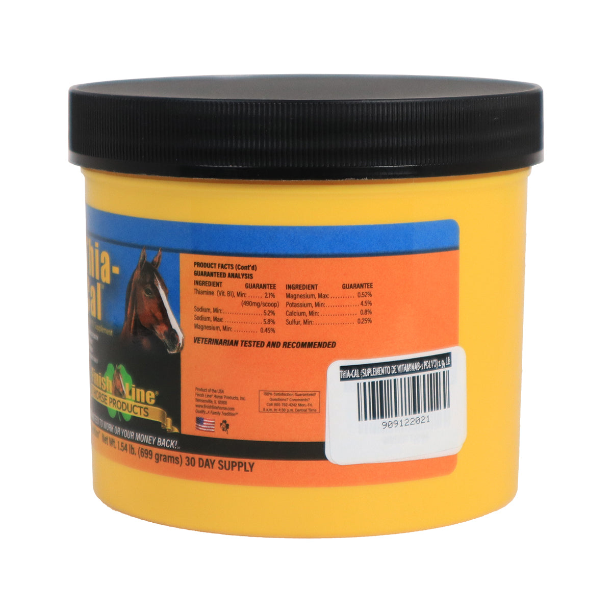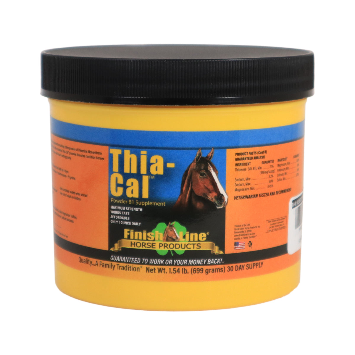 Thia-Cal Suplemento B-1 699 gr es un suplemento alimenticio en polvo que promueve la sensación de relajación y alerta mental sin somnolencia. Contiene una combinación equilibrada de tiamina, magnesio y calcio que ayuda a mantener la energía y calmar a su caballo sin la presencia de triptófano, raíz de valeriana o kava. Fácil de añadir a la alimentación diaria.