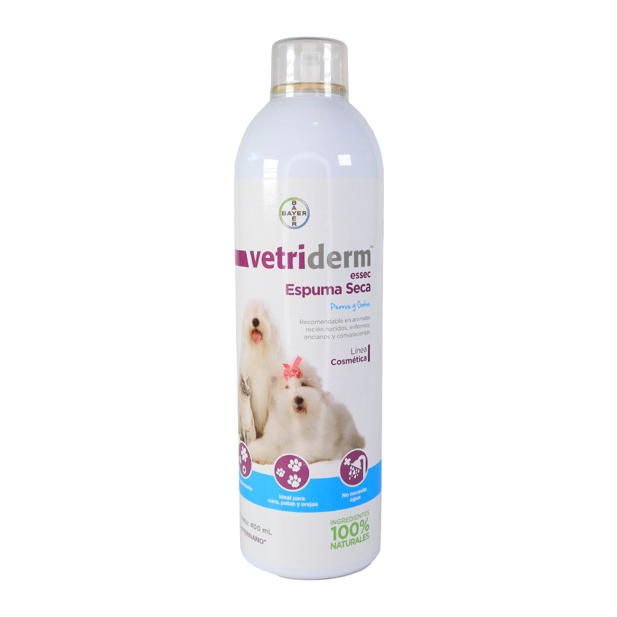 Vetriderm Essec espuma seca 400 ml es un shampoo en espuma seca diseñado para el cuidado y limpieza de perros y gatos. Es ideal cuando no se puede utilizar agua, perfecto para mascotas que le temen al agua o que no pueden mojarse por razones médicas. Proporciona un pelaje limpio y con un olor agradable.
