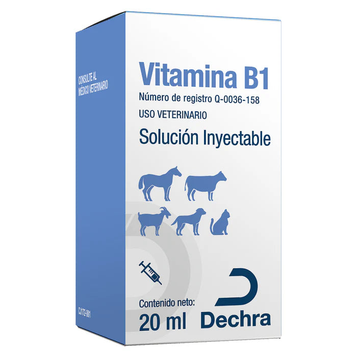 La Vitamina B1 – 20 ml es una solución inyectable indicada en casos de deficiencia de tiamina, la cual puede manifestarse con retraso en el crecimiento, anorexia, alteraciones del sistema nervioso, taquiarritmias, bradiarritmias o en situaciones de intoxicación por etilenglicol. Su uso ayuda a restablecer el equilibrio metabólico y a mejorar la condición general de los animales.