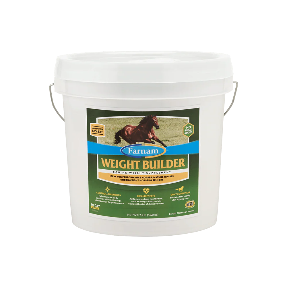 Weight Builder es un suplemento para aumentar el peso en equinos que agrega calorías de fácil digestión sin necesidad de incrementar el consumo de granos, evitando el riesgo de malestar digestivo. Su fórmula está enriquecida con grasas saludables, ácidos grasos omega-3, harina de linaza y salvado de arroz termoestabilizado, ideales para promover un peso óptimo, mejorar la condición corporal y mantener un pelaje brillante.